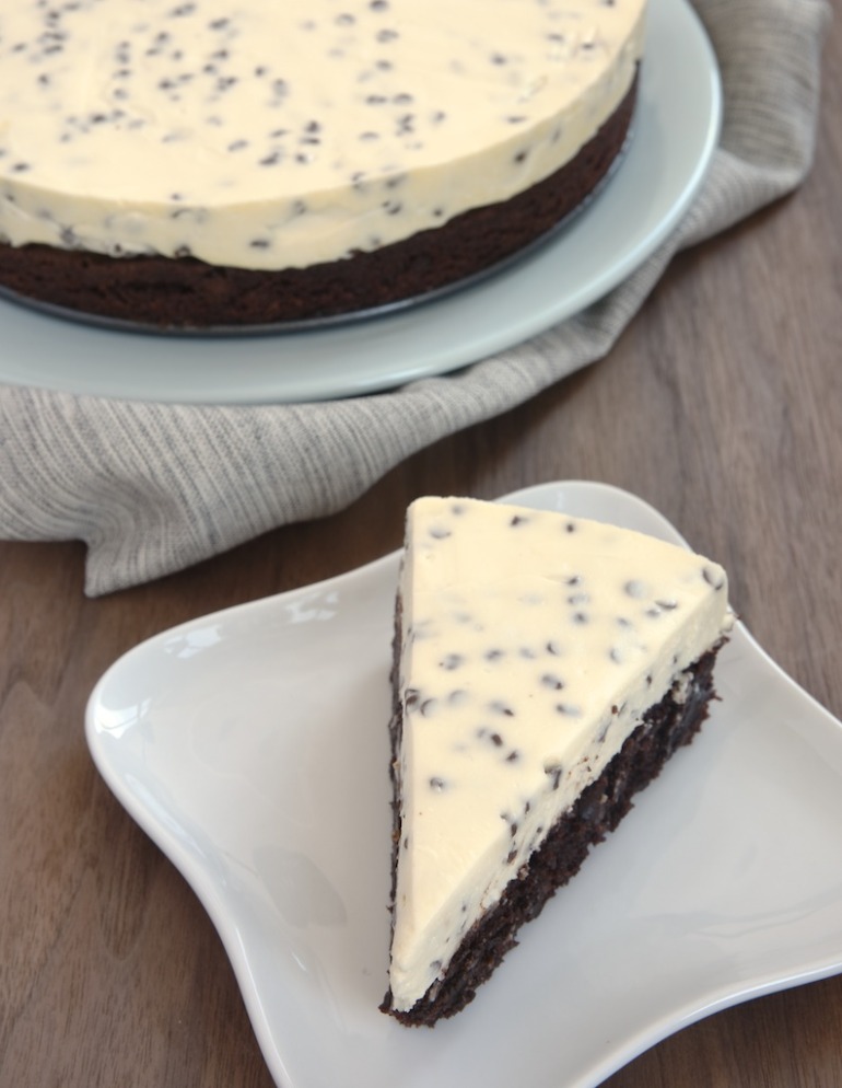 It all starts with a fudgy brownie that will serve as the crust of the cheesecake. Then, that’s topped off with a simple no-bake cheesecake packed with plenty of chocolate chips. See? You get brownies AND cheesecake! Win-win!